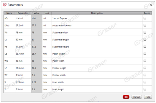 2 设定 Patch Antenna 各项设计参数 选择 Edit > Parameters,按鼠标右键选择 Add,按以下表格添加各参数名称及其数值,设定完成后按 OK: