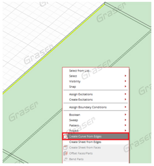 6 为了能够进行模拟,必须设定激发端口(ports)于设计中 “Shift+E” 切换到 Edge 选择模式 > 选择 “Feed-Line”对象底面 > 右键并选择 Create Curve from Edges: