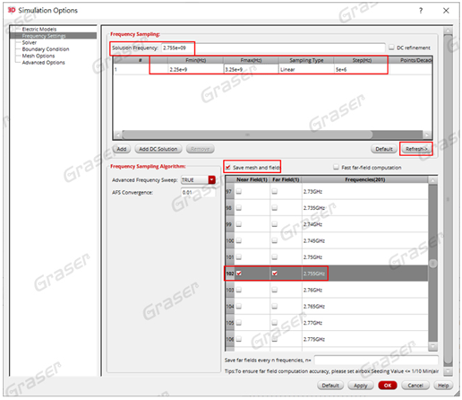 8 接着产生模拟边界,并设定边界条件 在菜单中点选 Parts > Bounding Box,选择 Absolute offset,并将值设定至 50mm,按 OK: “Shift+F” 切换至 Face 选择模式,接着从 Project 中选择 BoundingBox ,在模拟窗口中按右键,选择 Assign Boundary Conditions > ABC: 以上步骤就已经完成 Patch 天线的模型(Model)编辑。 9 设定模拟解析频率为 2.755GHz,模拟频率范围 2.25 到 3.25GHz,以 5MHz 为一个step size 于上方选单中点选 Solver > Analysis Setup > Simulation Options > Frequency Setting ,在 Solution Frequency 字段里输入 2.75e+9 并设置频率范围后按下 Refresh,接着勾选 Save mesh and fields 、以及 2.755GHz 的 Near field 和 Far field: